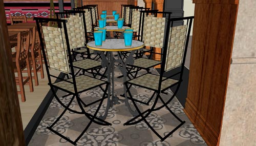 En la entrada una magnífica puerta en madera labrada de más de tres metros de altura, queda abierta para entrar en un mundo de sensaciones sabores y olores. El entorno en la planta baja le llamamos "desierto" y recreamos el maravilloso cielo del desierto bajo el que poder degustar todos los manjares. En colores arena y cielo del anochecer. Telas traídas de Jordania, las columnas se convierten en majestuosas palmeras,... todo ambientado para entrar en un mundo de sensaciones!